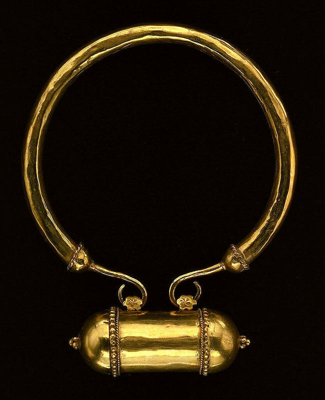 Questo bracciale cavo con custodia per amuleto è stato realizzato martellando fogli d'oro in forme tubolari e applicando sulla superficie minuscole sfere e filo intrecciato in motivi intricati. L'amuleto doveva contenere versetti del Corano appositamente preparati e avvolti strettamente da uno specialista.
