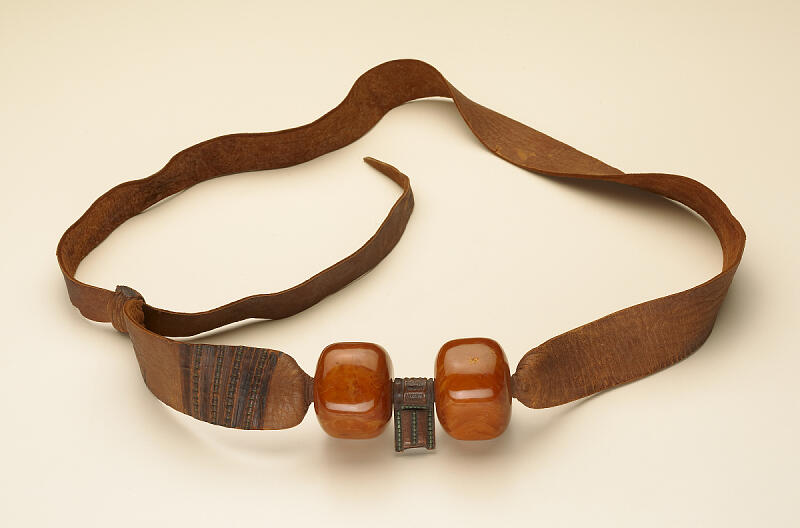 Il piccolo rettangolo ricoperto di pelle tra le due grandi perle è un amuleto che probabilmente contiene versi relativi all'Islam. Come veniva indossato e da chi non si sa. Le perle sono notevolmente grandi e in ottime condizioni considerando che sono molto fragili. Sono fatti di una resina locale, quella che gli specialisti delle perline chiamano ambra etnica.